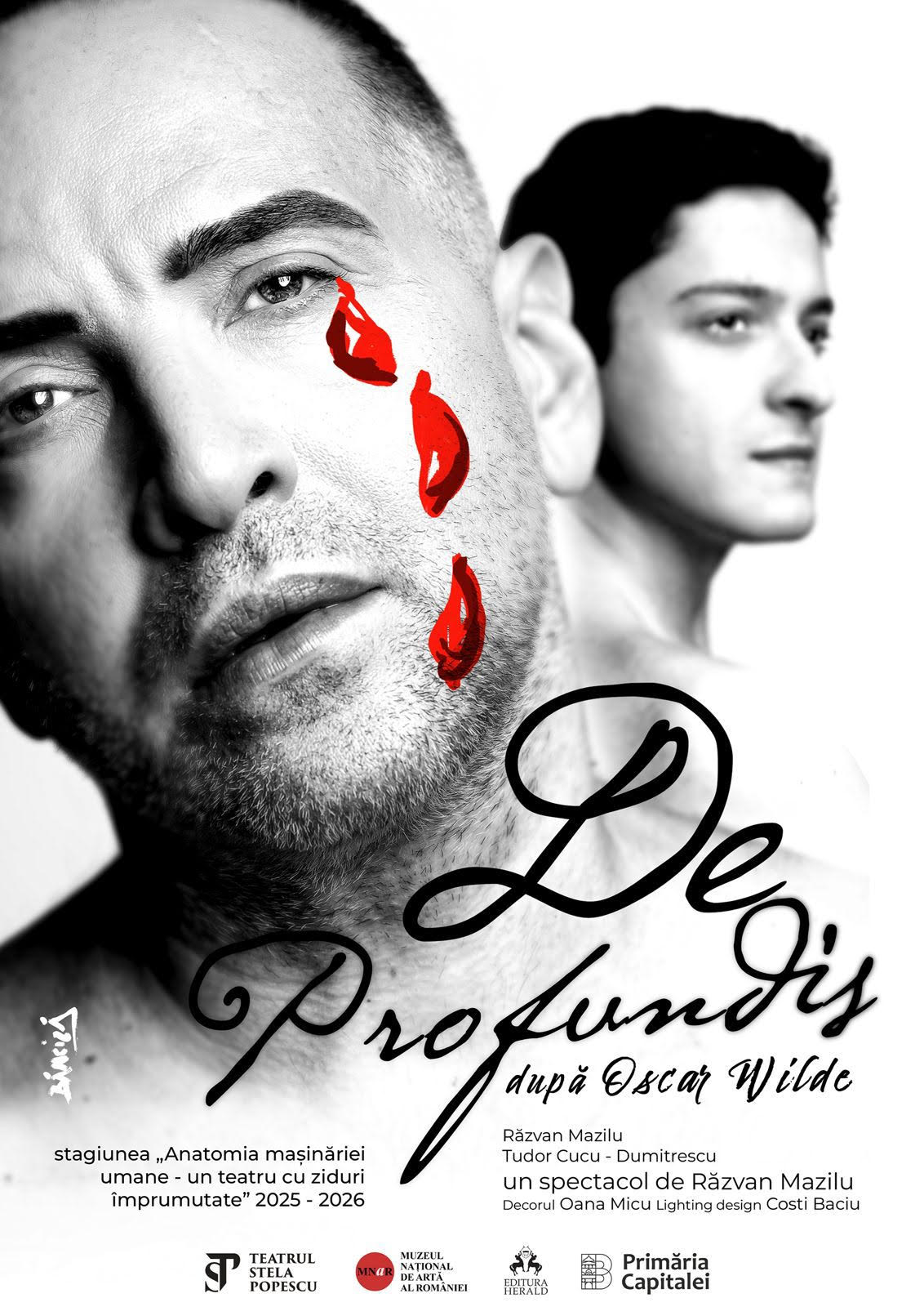 Distribuția ”De Profundis” reunește pe scenă pe Răzvan Mazilu și Tudor Cucu Dumitrescu, într-o montare în care scenografia poartă semnătura Oanei Micu, iar lightdesignul îi aparține lui Costi Baciu.